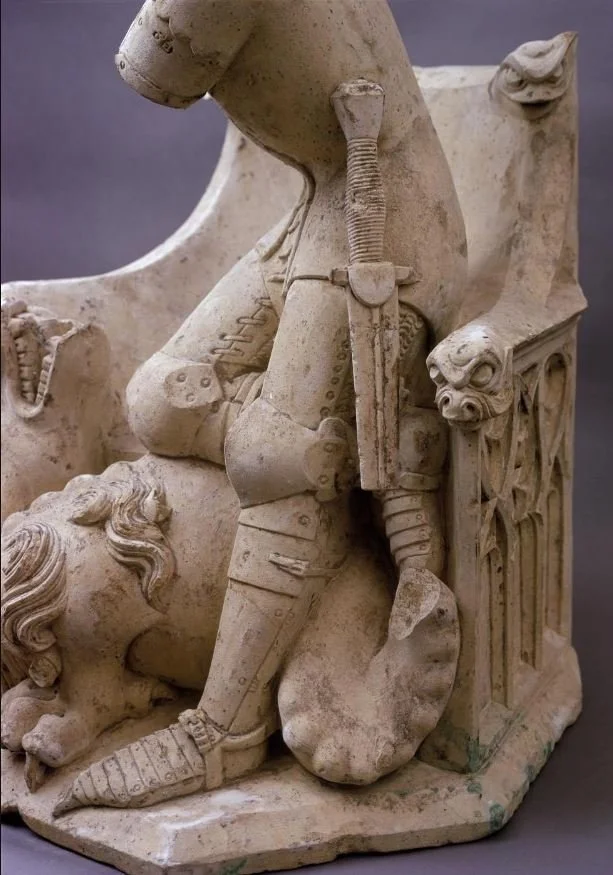This scabbard is based on artistic depictions from 14th-15th century in western and central Europe, as well as modern reproductions which I found quite motivating. Examples of scabbards from this time period include the depiction on Ulrich Landschaden’s funerary monument (1369), Peter of Stettenberg’s funerary monument (1441), and a painted panel of Saint Martin parting his cloak (around 1460-70) in the Rottenburg Diocesan Museum. For reference photos, please see the attached documents.