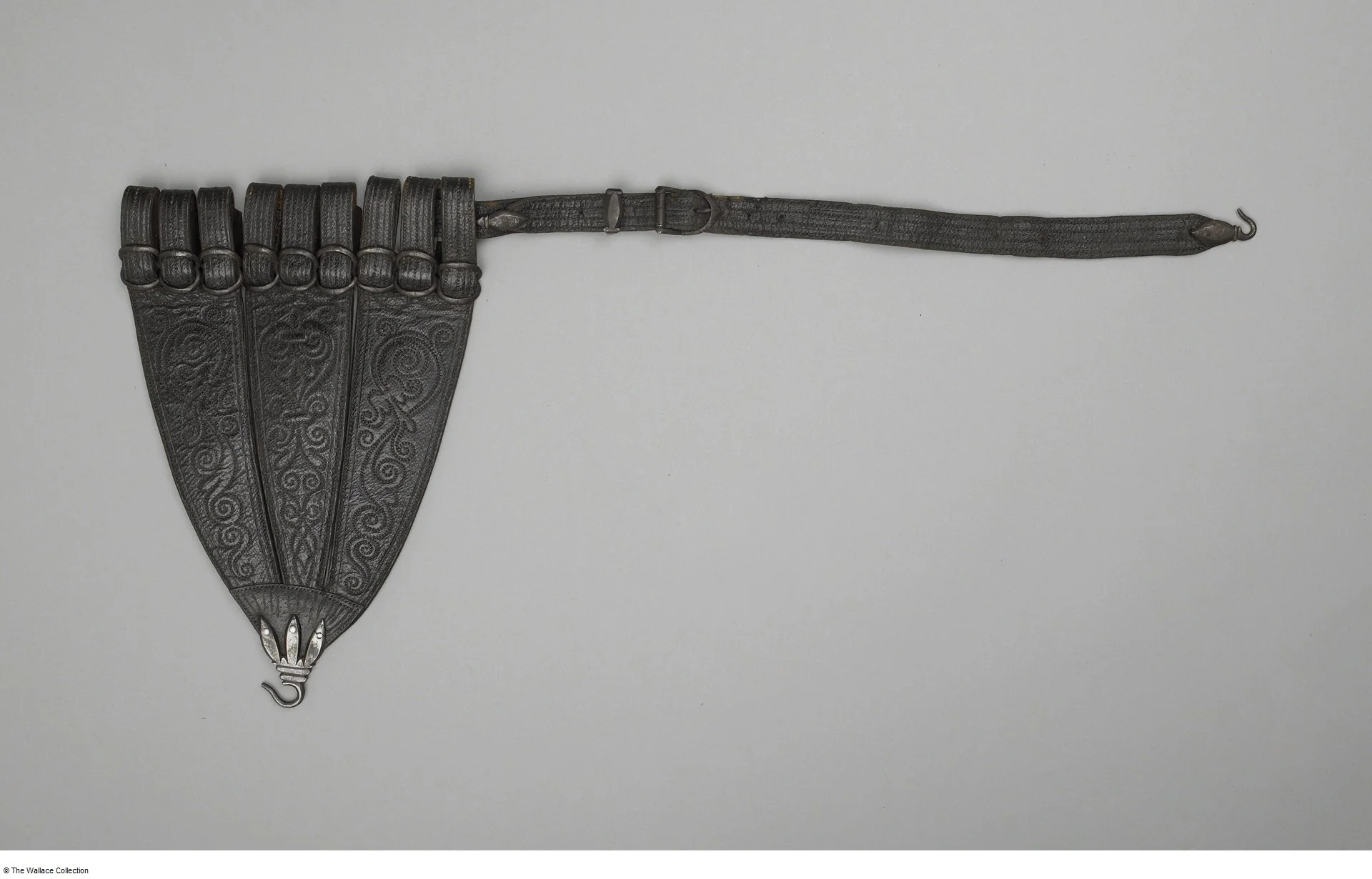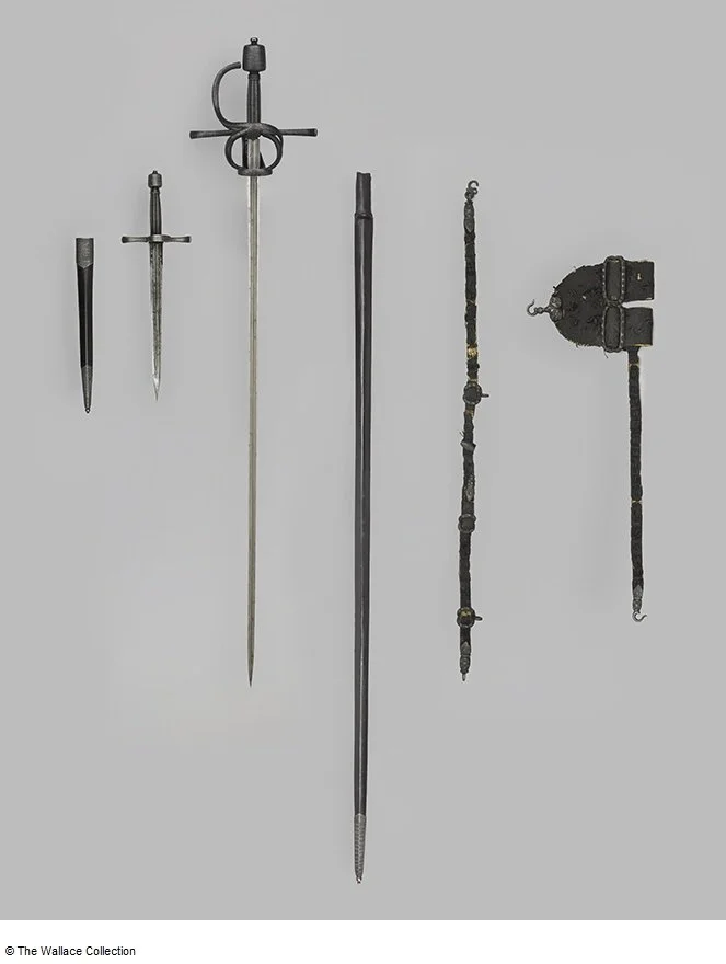 This scabbard and hanger are based on surviving examples and artistic depictions from the 16th-17th century in western and central Europe. Examples of hangers from this time period can be found in the Wallace Collection. For reference photos, please see the attached documents.