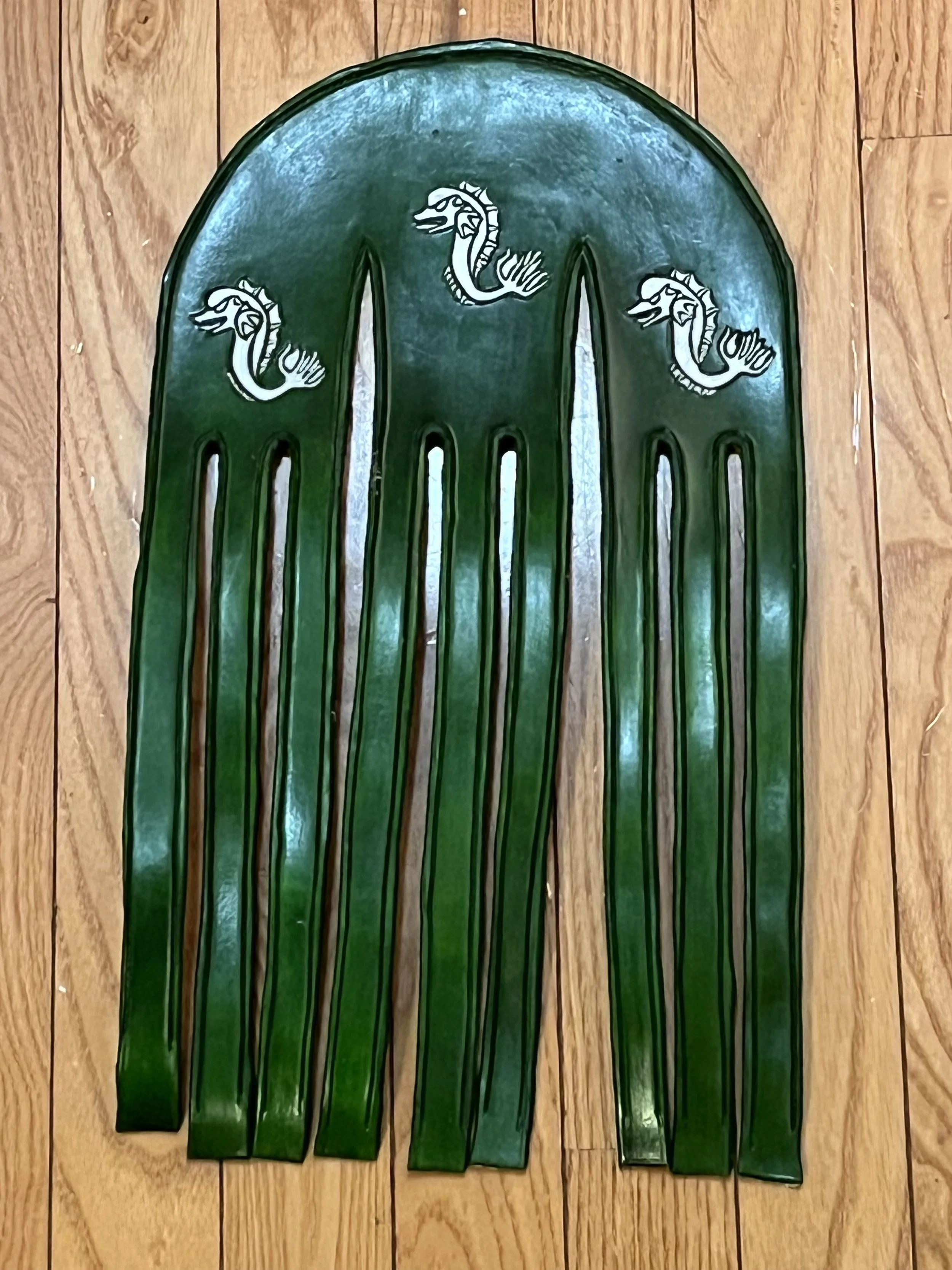 The person this scabbard is for, Stefen von Baden, wanted a green base with silver heraldic dolphins (which are elements of his heraldry). So, I incorporated these features.