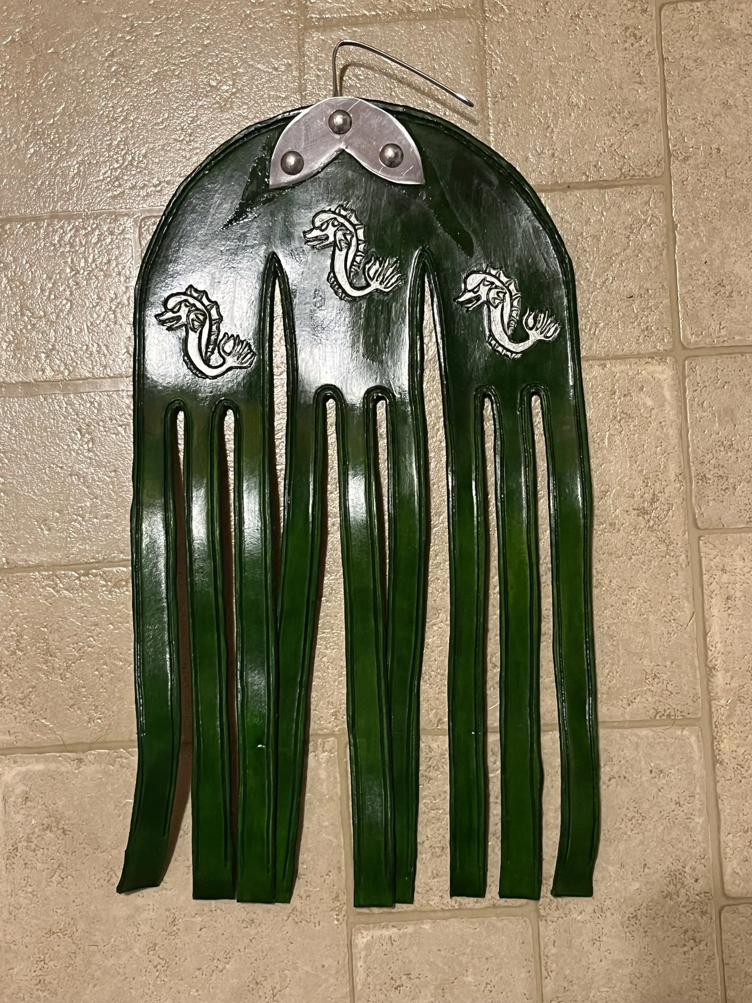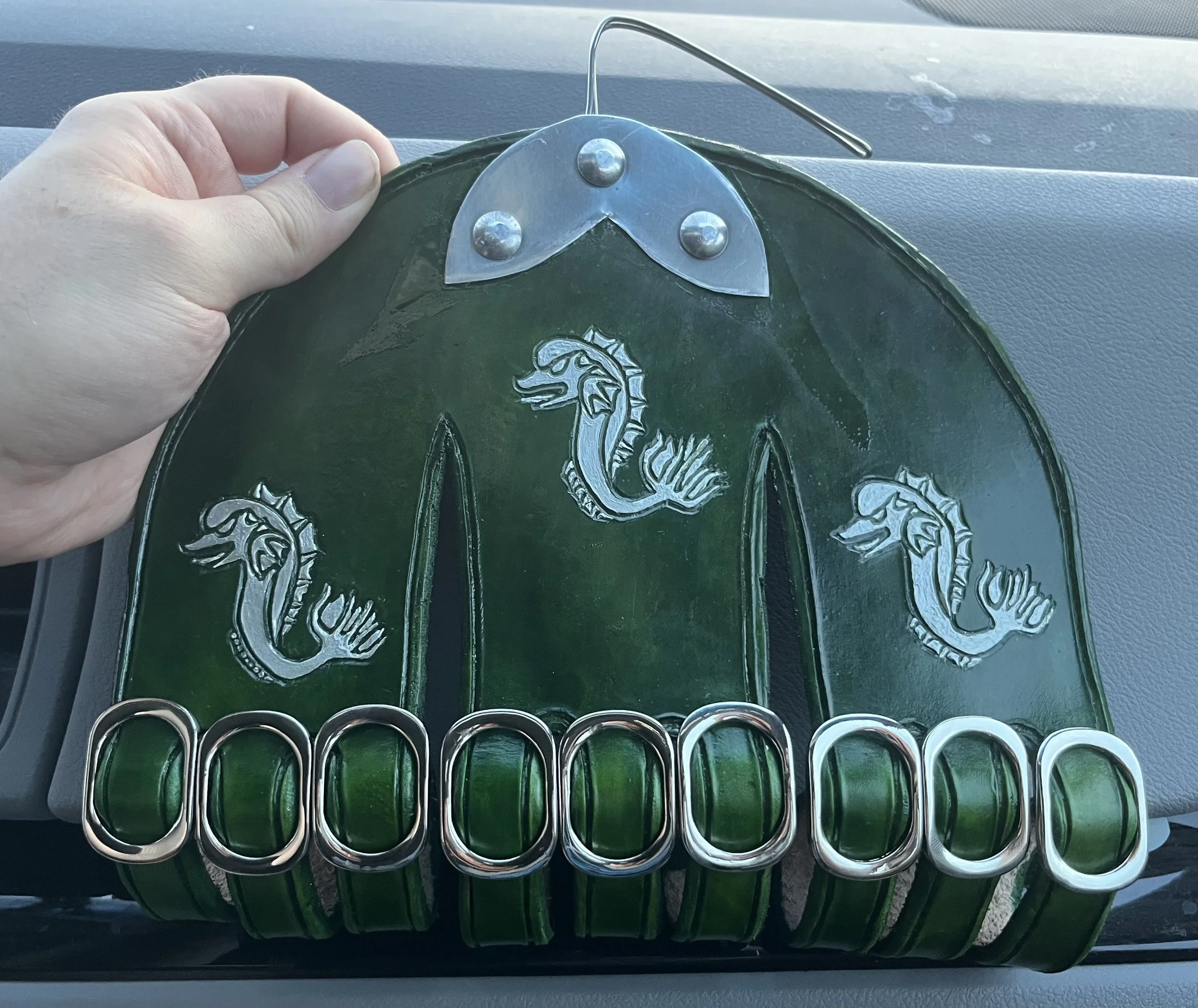 Finally - the belts. As a result of the hanger requiring specialized fittings, it cannot easily connect to an existing belt. So, I made a specialized sword belt for this scabbard and hanger. The belt is made of 4 mm leather. It is covered in tooling, repeating the S-shape of the scabbard, and dyed green to match the scabbard and hanger. The leather I had was not quite long enough, so I made the belt in two halves. Oddly, I remember seeing more than one connection point for sword belts in period examples. I have no idea why this is the case, but I was glad to have the excuse to replicate it under the circumstances.