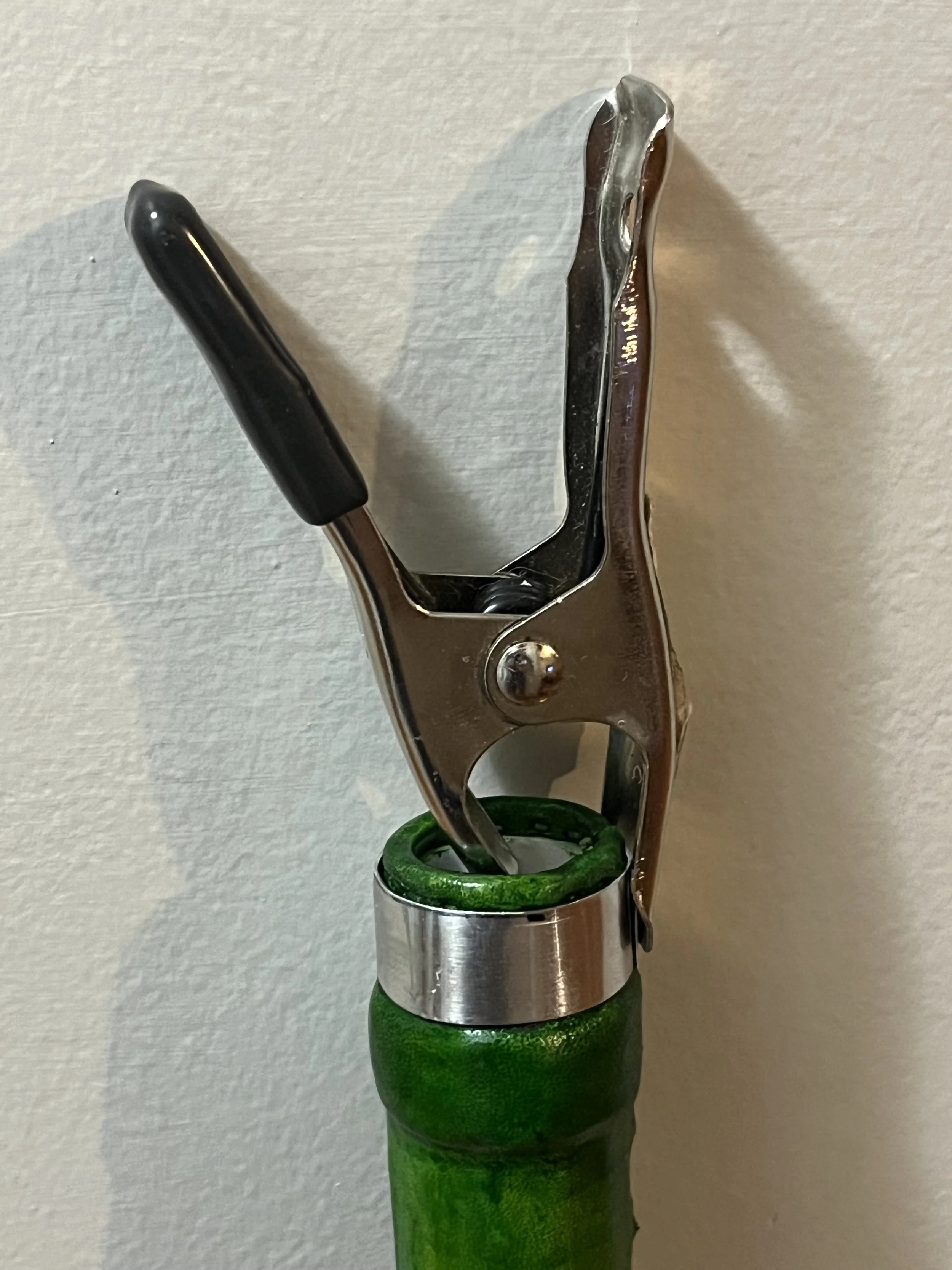 I followed a similar process to add a metal band around the mouth of the scabbard. I measured the space between the mouth and the riser, cut a band of aluminum, and affixed it. I tried to solder the band closed. Turns out… this was too ambitious. However, epoxy and clamps got the job done.