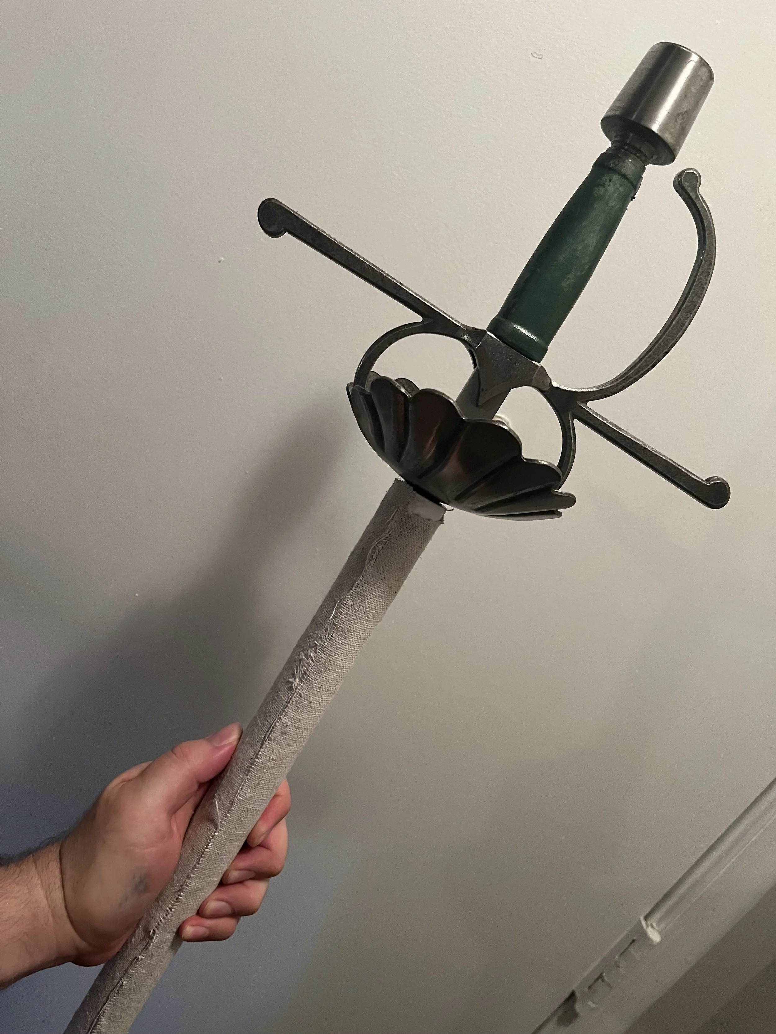 A rapier scabbard presents a unique challenge: it does not hang directly from the belt. Rather, it connects to a part called a hanger, and the hanger requires specific hardware to then connect the whole set-up to a belt. I attempted to cast this hardware out of bronze. I… well… I will have to try this again at some point. Instead, I got 12 buckles, some stainless-steel wire, and improvised!
