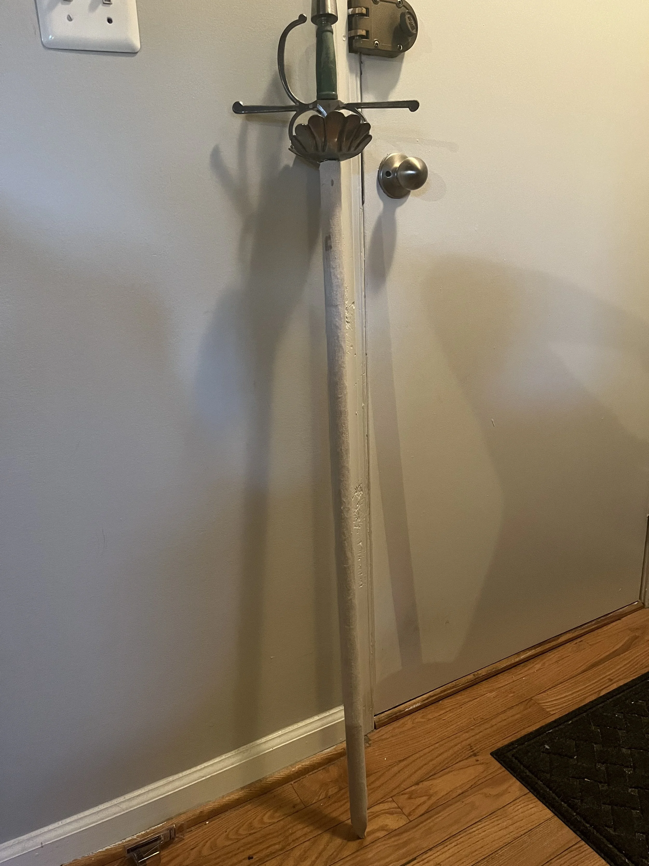 The next step is to cut the pipe to the appropriate length, which will be the sword blade’s length plus 1.5 inches. I recommend adding an extra 1.5 inches to allow for shaping. Once it is cut, the end will need to be shaped. Using a heat gun, heat the tip of the pipe until it is soft enough to be compressed. This may take a hot minute (ha!) and I recommend using a pair of insulated gloves to not burn yourself while heating the pipe. Once the tip is soft, take a clamp and compress the pipe until it closes completely. Leave the pipe to cool completely. Once it is cool, check to make sure the sword will still fit completely inside the pipe. If it does, mark off the flattened end to add a taper. Using a saw or Dremel tool cut away the excess plastic to make the taper at the compressed tip.